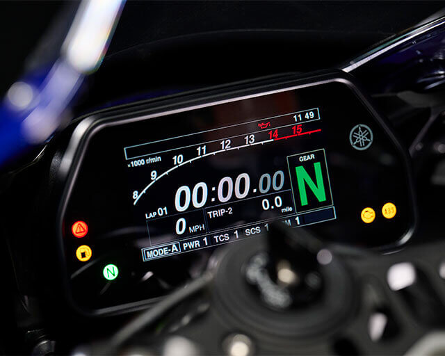 The 6-axis Inertial Measurement Unit (IMU) consists of a gyro sensor (angular velocity sensor) that constantly measures machine pitch, roll and yaw, and a G-sensor (accelerometer) that measures acceleration in the forward-backward, up-down and right-left directions. This technology makes possible the class-leading array of rider aids includes lean sensitive Traction Control System (TCS), Slide Control System (SCS) as well as a front wheel lift control system (LIF) and Brake Control system (BC).