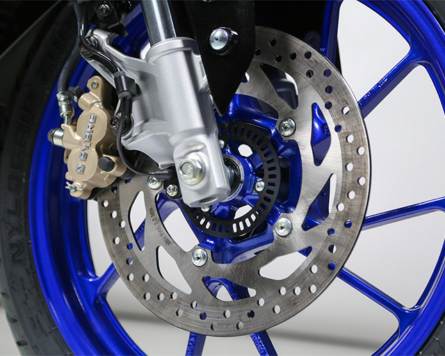 To take the sporty handling on twisty roads to the next level, the new R15M employs an upside down front suspension fork with 37mm inner tubes. Upside down front forks improve rigidity and provide stability while taking high speed turns or during high braking input.