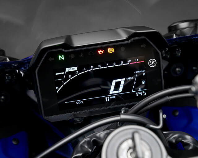 The YZF-R7 features a full LCD instrument panel. The high-contrast negative dashboard and its compact and lightweight multifunction display with larger displays for the clock, gear, trip meters and tachometer provide clear information. The use of spot colour gives an accent for the high-rpm range display – and new handlebar switches enables the rider to operate the meter more easily and efficiently.