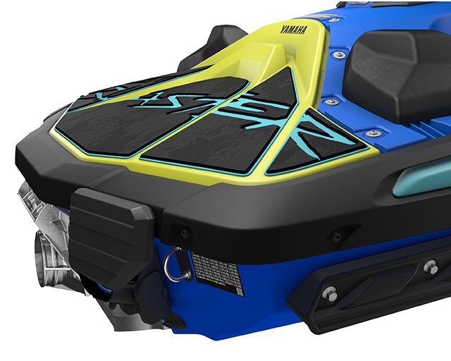 Above the waterline, sees Yamaha’s first-ever reinforced polypropylene deck, creating improved riding dynamics and a sharper and more aggressive look to the craft.